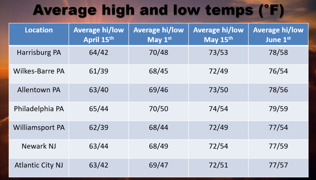Average high temperatures are currently in the 62-66°F range from north to south across our coverage region, which is about 3°F higher than at this point last week. The rate of increase in average high and low temperatures has accelerated since the vernal equinox. Any above or below average stretches listed in the outlook will be relative to seasonal norms at that time, and it is important to note that cooler/warmer periods will be relative to the time of year we are talking about. For example, the slightly below average temperatures listed in the April 27th-May 2nd period features highs in the low to mid 60s, coming at a time when average highs are in the upper 60s to near 70 degrees. Use the average highs/lows chart below providing a point of reference and transparency for what average temperatures are expected to be at each corresponding location through June 1st.