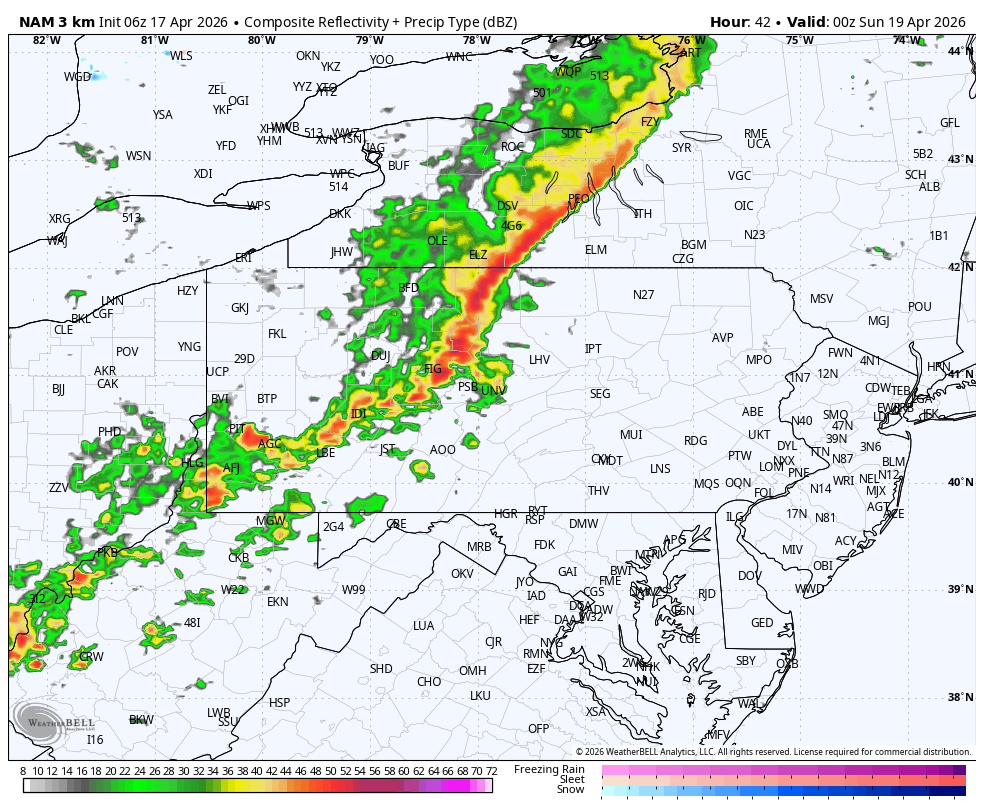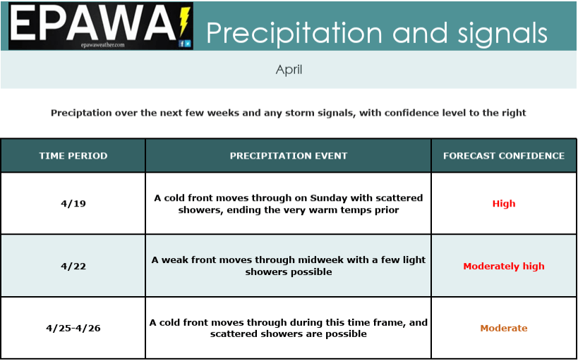 Shorter term, and in actuality the same theme over the next few weeks, is a series of cold fronts that will move through at different times over the remainder of April. The first of these fronts will be a stronger one, which moves through on Sunday with scattered showers that begins late Saturday night in some interior areas. A weak front will move through late Tuesday night and early Wednesday with perhaps a quick shower or two in spots.  Another cold front moves through the following weekend with scattered showers possible as the front moves through. The overall theme is a frontal passage every 3 days or so, but with limited precipitation.