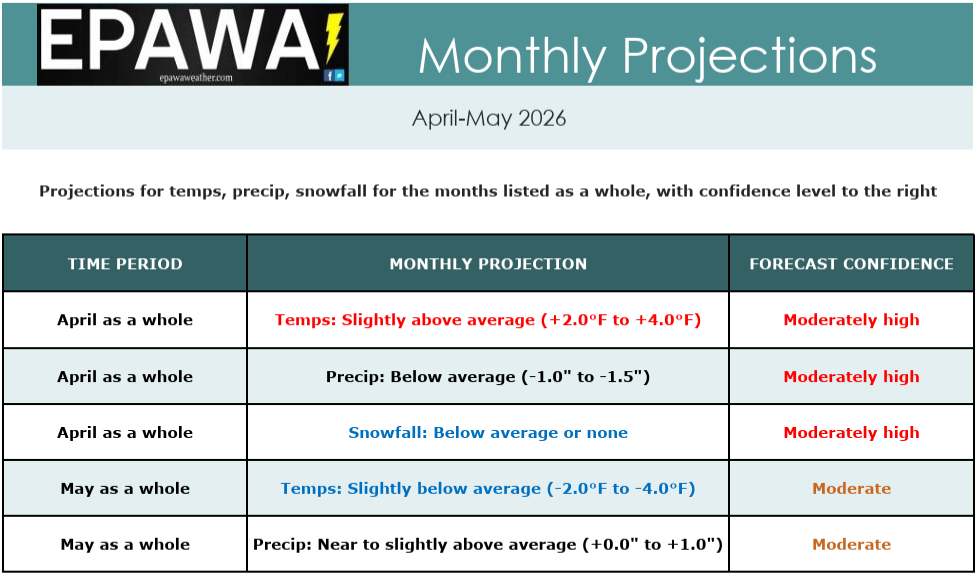 April temperature projections were adjusted this week to a slightly above average (+2.0°F to +4.0°F) temperature departure for the month as a whole, with ridging dominating thus far, balancing cooler risks at times over the remainder of April. The month of May projections were also maintained this week for a slightly below average (-2.0°F to -4.0°F) temperature departure for the month as a whole using long term climate guidance and global observation trends.
