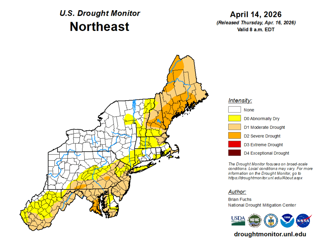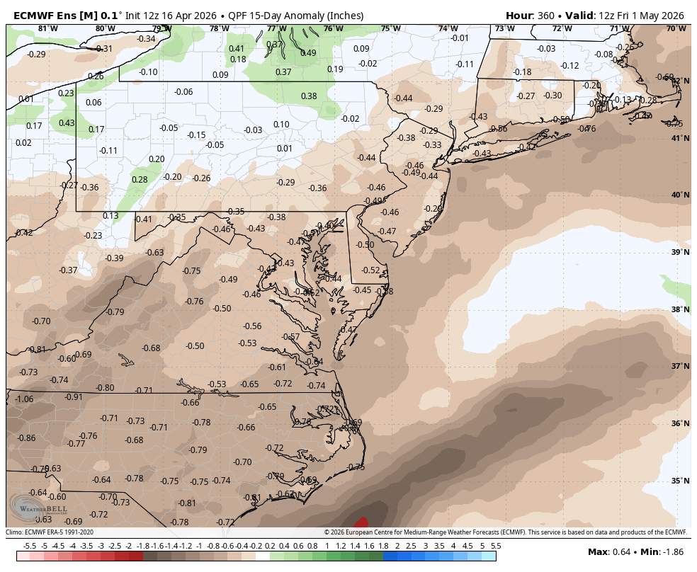 OVERVIEW: The US drought monitor (photo toward the bottom of this outlook) saw little change across interior areas this week, but the formerly abnormally dry areas in SE PA and Central/Southern NJ have been upgraded to moderate drought status. Two areas of severe drought (D2) remain across Southern Berks County in SE PA, and well as portions of Franklin County in South Central PA. Parts of North Central and NE PA currently have no drought or abnormally dry designation, as well as far southern Delaware. Overall dryness indicated is largely due to a much drier than average pattern overall since August sans a wetter March for the interior. April projections were slightly adjusted this week to a below average (-1.0″ to -1.5″) precipitation departure with generally drier periods over the remaining two weeks, and below average snowfall…. or more likely none at all. Projections for the month of May were maintained this week for a near to slightly above average (0.0″ to +1.0″) monthly precipitation departure.