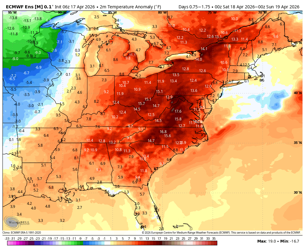 • Another major sudden stratospheric warming event (SSWE) took place last week, leading to a breakdown of the stratospheric polar vortex and notable warming over the polar regions. Stratospheric winds at 10 hPa reversed from westerly to easterly, which defines a major SSW event. Unlike past SSW events in March, this zonal wind reversal is forecast to have sustainability, playing a critical role in maintaining cooler temperature anomaly risks late April and throughout the month of May. This is one of the reasons why the end of April and May (as a whole) are projected to be cooler than average. “Cooler” is of course relative, and the slightly below average temperatures are relative to normal highs at that time, which are well into the 60s and even 70s in the 2nd week of May. Late-season SSWEs are not particularly uncommon, but the cooler temperatures relative to average is a result of high latitude blocking (-NAO) that consolidates over Greenland.